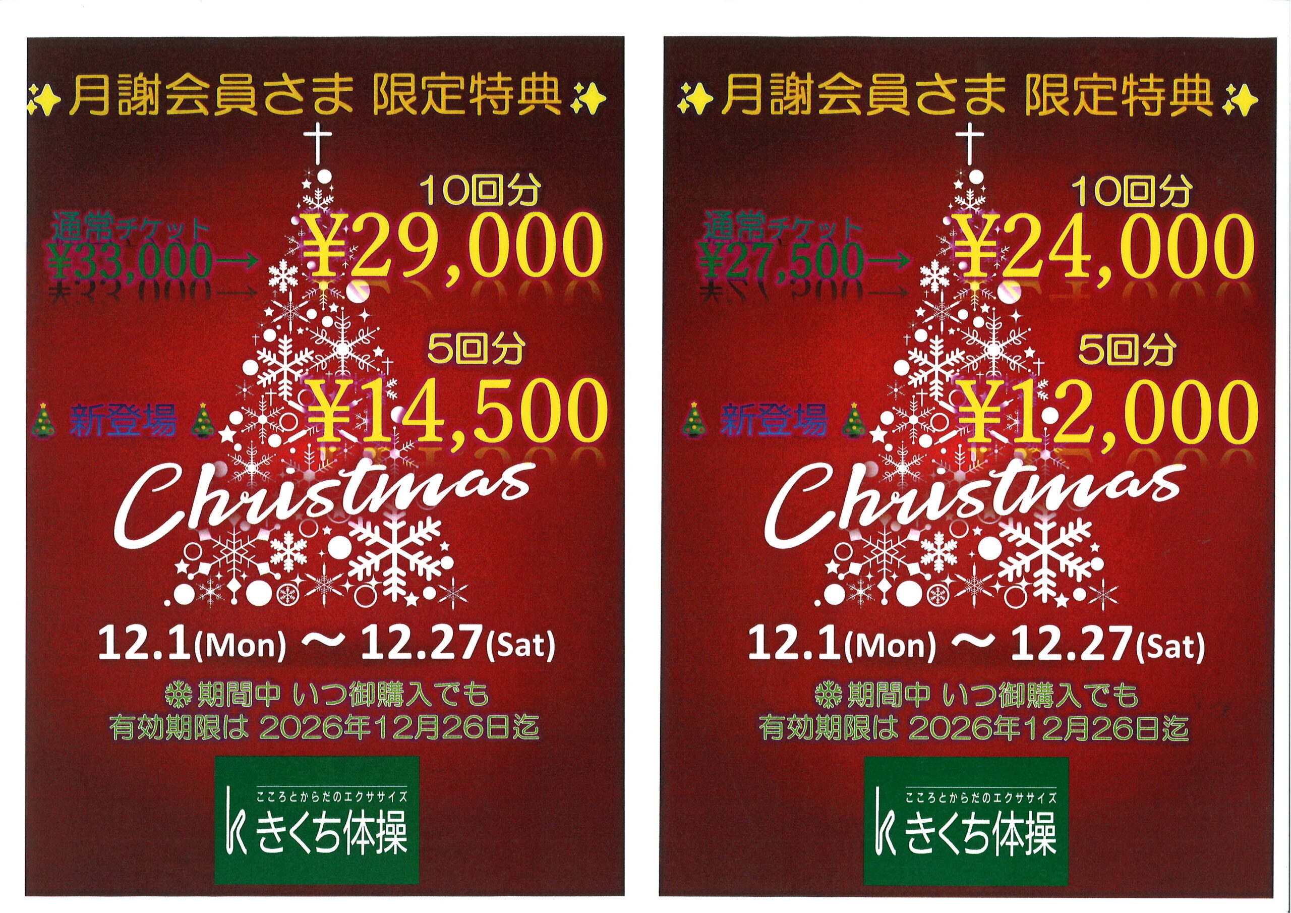 月謝会員の会員様限定特典🎁 クリスマスチケットは、通常チケットよりかなりお得なチケットです✨ 🎄川崎スタジオ・四谷スタジオの月謝会員の生徒さま 通常チケット価格¥33,000→¥29,000✨ 🎄戸塚スタジオ・あざみ野スタジオの月謝会員の生徒さま 通常チケット価格¥27,500→¥24…